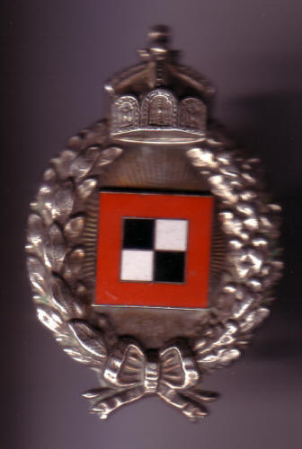 The observer´s badge The Observer´s badge was introduced on 27th January 1914 by the Kaiser (Army Order 1914 number 13). It consists of a silver metal wreath (oak leaves on the left, laurel leaves on the right). In the center of the wreath a black and white enameled sqare and on the top the Kaiser´s crown. It was awarded to officers who had a practice (on observer´s duty) of altogether at least 1000 km. It was worn on or below the left breast pocket. The Bavarian version of the badge has the bavarian king crown on top. |