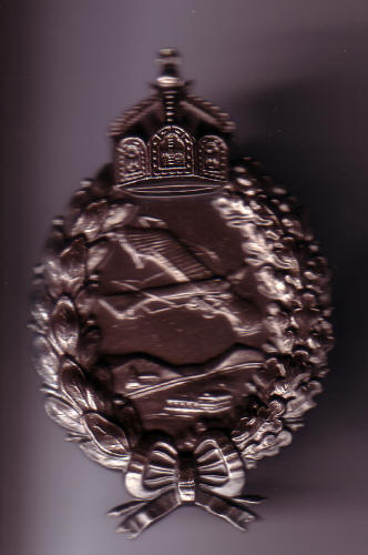 Abzeichen für Militärflugzeugführer Preußen Das Flugzeugführerabzeichen wurde am 27.01.1913 von Kaiser Wilhelm II. gestiftet. Das Abzeichen zeigt einen Eindecker Typ Taube über einer Landschaft fliegend, umrandet von einem Kranz aus: rechte Hälfte Lorbeer- und linke Hälfte Eichenlaubblättern. In der oberen Hälfte des Kranzes befindet sich die Kaiserkrone, in der unteren Hälfte eine Schleife. Das Abzeichen für bayerische Militärflugzeugführer zeigt statt der Kaiserkrone die bayerische Königskrone. The Pilot´s Badge The Pilot´s badge was introduced on 27th january 1913 by the Kaiser. See Army order number 474. The silver metal badge consists of a wreath (oak leaves on the left and laurel leaves on the right) in which a plane (a Taube) is flying over a landscape. On the top of the wreath the Kaiser´s crown is located. The badge was awarded on completion of flying training and was worn on or below the left breast pocket. The bavarian version of the badge has the bavarian king crown on top.