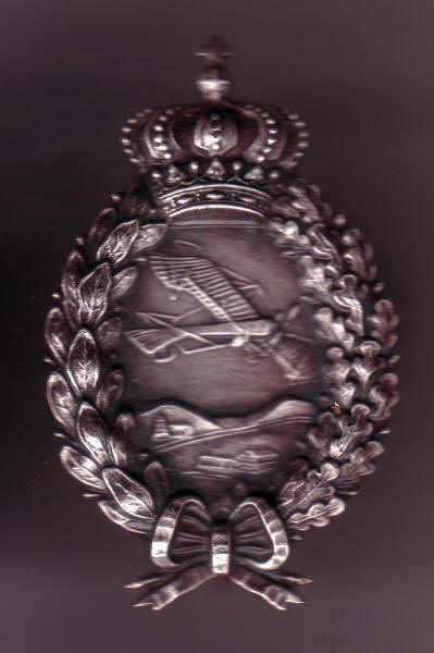 Abzeichen für Militärflugzeugführer Bayern Das Flugzeugführerabzeichen wurde am 27.01.1913 von Kaiser Wilhelm II. gestiftet. Das Abzeichen zeigt einen Eindecker Typ Taube über einer Landschaft fliegend, umrandet von einem Kranz aus: rechte Hälfte Lorbeer- und linke Hälfte Eichenlaubblättern. In der oberen Hälfte des Kranzes befindet sich die Kaiserkrone, in der unteren Hälfte eine Schleife. Das Abzeichen für bayerische Militärflugzeugführer zeigt statt der Kaiserkrone die bayerische Königskrone. The Pilot´s Badge The Pilot´s badge was introduced on 27th january 1913 by the Kaiser. See Army order number 474. The silver metal badge consists of a wreath (oak leaves on the left and laurel leaves on the right) in which a plane (a Taube) is flying over a landscape. On the top of the wreath the Kaiser´s crown is located. The badge was awarded on completion of flying training and was worn on or below the left breast pocket. The bavarian version of the badge has the bavarian king crown on top.