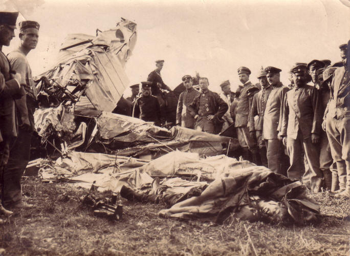 Der tote feindliche Pilot liegt in den Trümmern seiner Maschine.