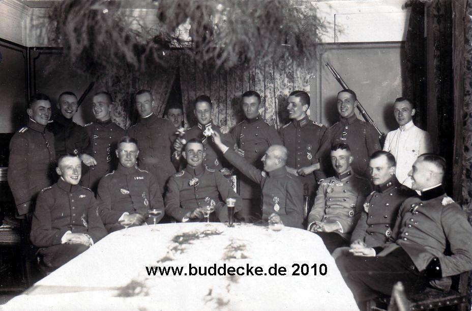 Zu Gast bei der Fliegerabteilung (Artillerie) 216. Sie wurde am 15.12.1916 aus der Artillerie-Fliegerabteilung 216 aufgestellt. Foto zeigt eine Feier, mittig sitzt ein bayerischer Beobachter umrahmt von Angehörigen der FA (A) 216. Wer kann Personen identifizieren. Hinweise bitte an Kontakt.