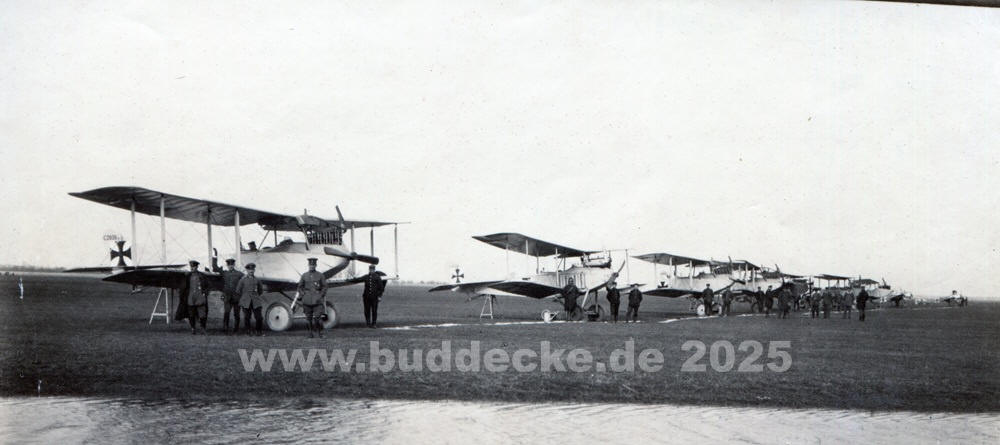 vor dem Start. Der Begleitschutz steht ganz rechts mit 2 Fokker E. II.