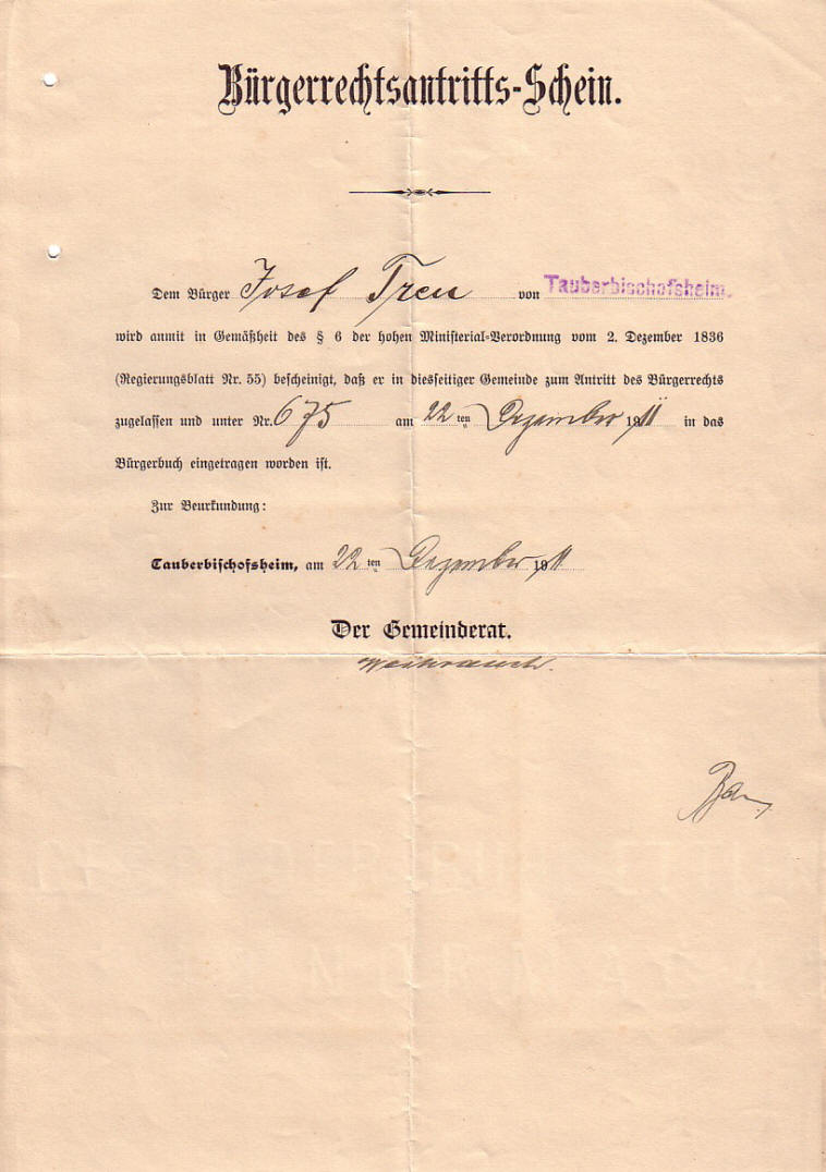 Bürgerrechtsantritts-Schein). In den Anfangsjahren seiner