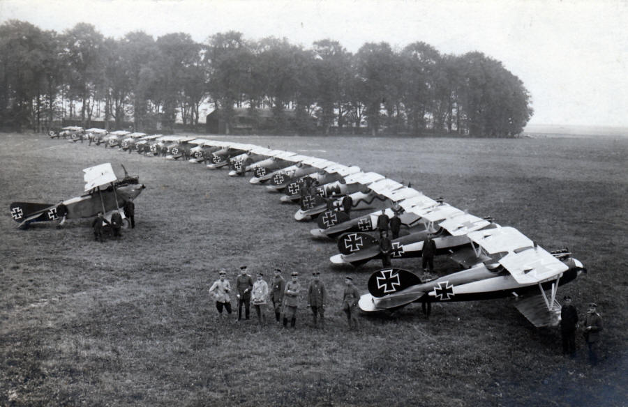 Flugzeuge Typ Albatros D. III und D V sowie links eine AEG C. IV.