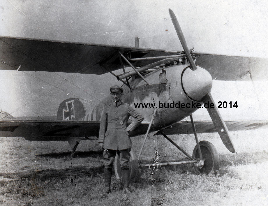 vor seinem Jagdflugzeug Typ Albatros D V mit dem "M" am Rumpf.