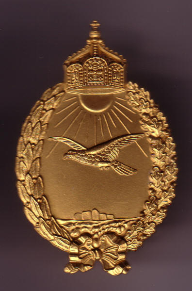 31.05.1913 vom Kaiser Wilhelm II. gestiftet: The Navy Pilots Badge Bestimmungen über Anlegung und Wiederablegung des Abzeichens für Marine-Flugzeugführer. 1. Das Abzeichen besteht aus Silber vergoldet und wird auf der linken Brustmitte, mittels Nadel befestigt, getragen; von den Offizieren wird es in gleicher Weise auch am Jackett angelegt. Über die Verleihung usw. des Abzeichens wird nachstehendes bestimmt: 2. Das Abzeichen wird denjenigen Offizieren sowie Unteroffizieren und Mannschaften verliehen, die auf einer Marine-Fliegerstation das Befähigungszeugnis als Marine-Flugzeugführer erworben haben. Von dem Beliehenen ist das Abzeichen so lange zu tragen, als er zum Marine-Flugzeugführer geeignet ist und demgemäß vom Werftdepartment des Reichs-Marine-Amts in der Liste der Marine-Flugzeugführer geführt wird. Bei Erfüllung dieser Voraussetzungen erfolgt die Verleihung des Abzeichens durch den Staatssekretär des Reichs-Marine-Amtes, der hierüber ein Besitzzeugnis ausstellt und die Überweisung des Abzeichens durch die Marine-Flieger-Abteilung veranlasst. 3. Der Kommandeur der Fliegerabteilung wacht darüber, ob die bei der Fliegerabteilung befindlichen Inhaber des Abzeichens die Geeignetheit zum Marine-Flugzeugführer noch besitzen, also auf der Liste der Marine-Flugzeugführer zu belassen sind. Die nicht bei der Fliegerabteilung befindlichen Inhaber des Abzeichens müssen durch regelmäßig wiederholte Dienstleistungen bei dieser ihre Befähigung zum Flugzeugführer von Zeit zu Zeit erneut nachweisen; sie sollen hierzu grundsätzlich mindestens 2 x im Jahre zur Marine-Flieger-Abteilung - auf je 4 Wochen - kommandiert werden. Zeigt sich bei einer Dienstleistung, dass der Kommandierte die Eigenschaft als Marine-Flugzeugführer nicht mehr besitzt, so wird er von der Liste gestrichen. In besonderen Fällen kann ausnahmsweise eine Verlängerung der Dienstleistung genehmigt werden, um dem Kommandierten Gelegenheit zu geben, die Geeignetheit wieder zu erwerben. Die Dienstleistungen werden im übrigen von dem Staatssekretär des Reichs-Marine-Amtes angeordnet. 4. Inhaber des Abzeichens, die von der Liste gestrichen sind, haben es mit dem Besitzzeugnis grundsätzlich sogleich nach dem Empfang der Mitteilung hierüber an ihre nächstvorgesetzte Dienststelle abzuliefern. Die weitere Aufbewahrung erfolgt bei der Flieger-Abteilung. Das Besitzzeugnis ist dem Staatssekretär des Reichs-Marine-Amts auf dem Dienstwege einzureichen. Liegen besondere Umstände vor (z.B. wenn der Inhaber des Abzeichens die Befähigung als Marine-Flugzeugführer infolge eines Unfalls im Fliegerdienst eingebüßt hat), die die Weiterbelassung des Abzeichens trotz der Streichung des Inhabers von der Liste gerechtfertigt erscheinen lassen, so ist dies bei dem Staatssekretär der Reichs-Marine-Amts zu beantragen. 5. Inhaber des Abzeichens, die zum Beurlaubtenstand übertreten oder aus dem Marineverhältnis ausscheiden, können grundsätzlich nur dann auf der Liste der Marine-Flugzeugführer belassen werden, wenn sie sich vor ihrem Ausscheiden schriftlich verpflichten, Wiederholungsübungen in dem nach Ziffer 3 vorgeschriebenen Umfang abzuleisten. Diese Übungen kommen auf die gesetzlich vorgeschriebenen in Anrechnung.